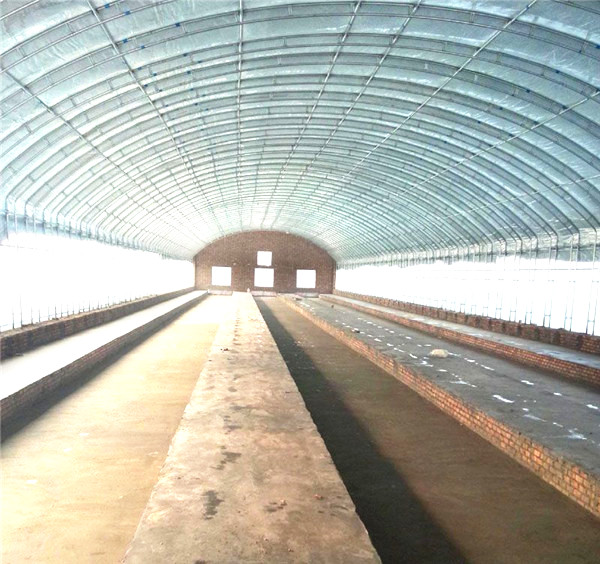二、在養殖圈上搭建塑料暖棚。以木桿、高粱秸稈等支撐物作棚架,上邊覆蓋留有通氣孔的塑料薄膜,而后將塑料薄膜四周用泥沙、草捆等壓嚴,這樣,可提高舍內溫度,達到保暖防寒目的。